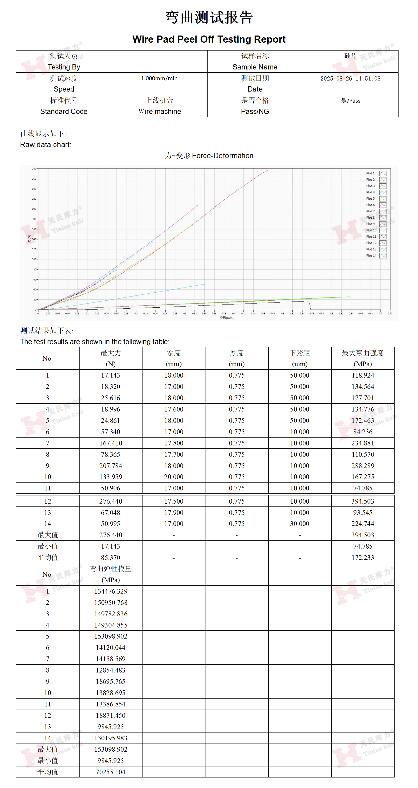 客戶采用了 TSKL-50D三點彎曲試驗機的立式彎曲測試模塊,對其生產(chǎn)的硅片進行了系統(tǒng)的三點彎曲試驗。該設(shè)備精度高、穩(wěn)定性好,能精準繪制載荷-位移曲線并自動計算斷裂強度。