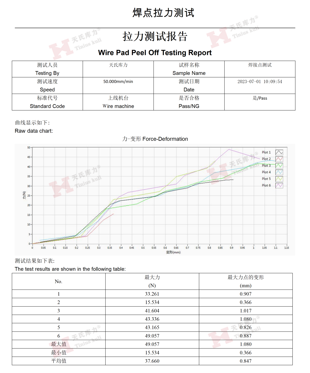 軟件自動(dòng)記錄下破壞瞬間的最大拉力值,該數(shù)值即為該接頭的拉拔力。此數(shù)據(jù)是評(píng)判焊接質(zhì)量的核心指標(biāo)。